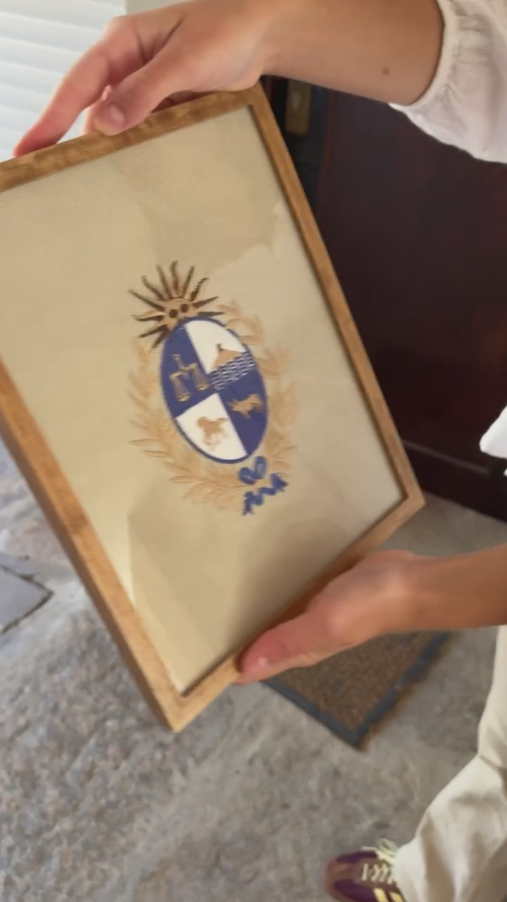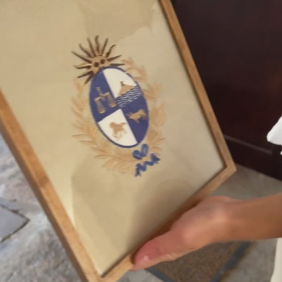 Cuadro con escudo de Uruguay bordado sobre lona. Enmarcado con vidrio y marco en madera marupá con lustre.