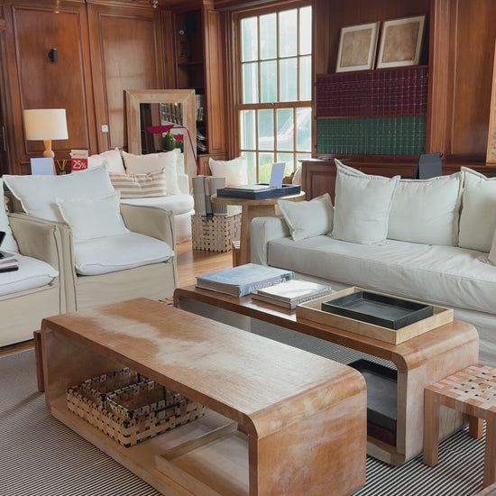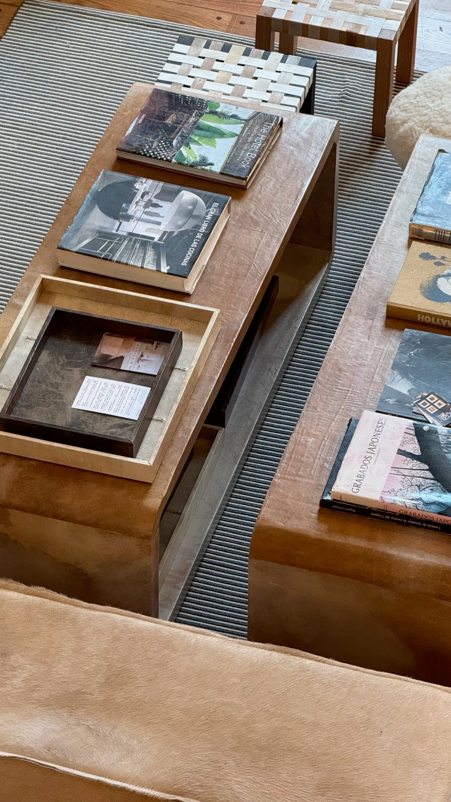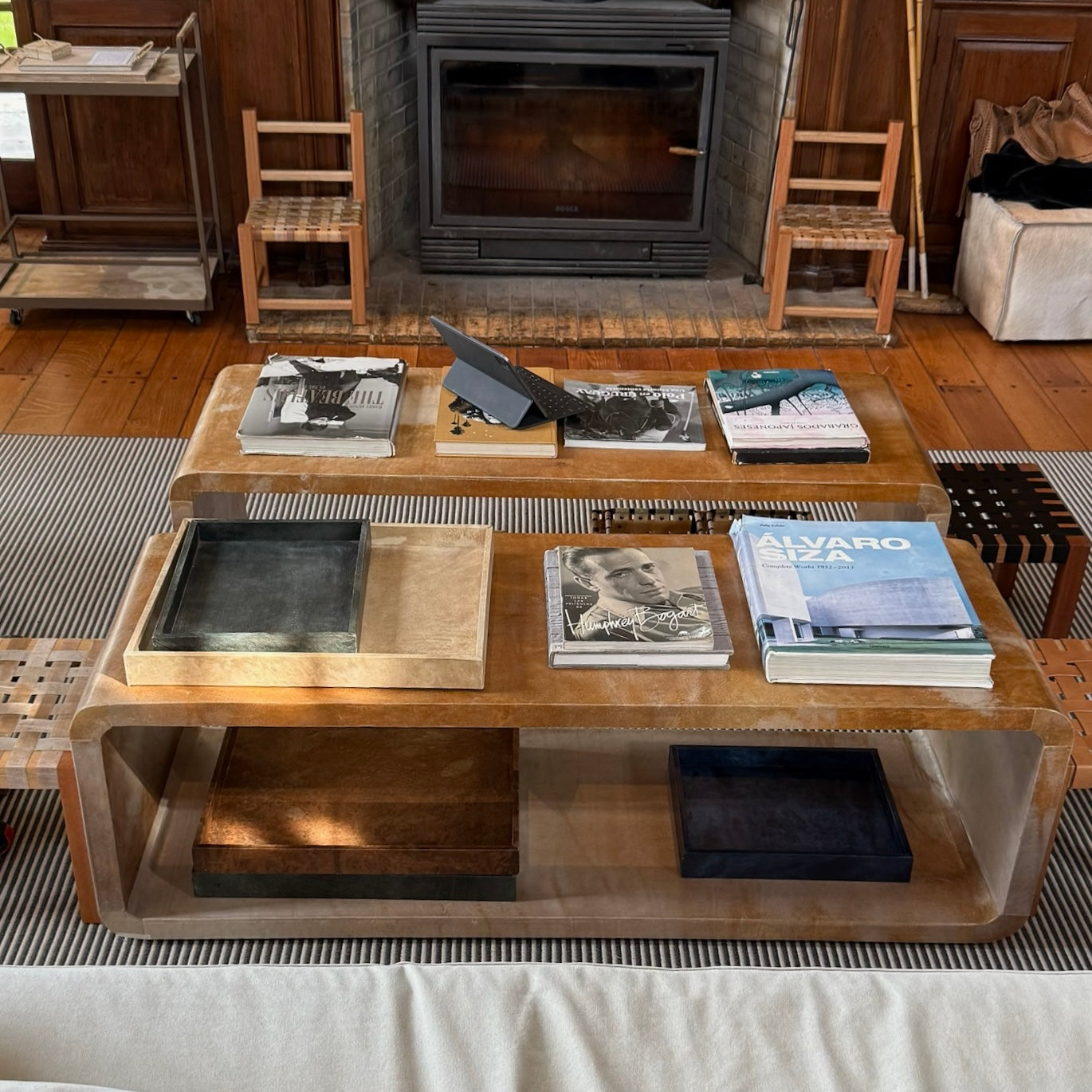 Mesa de living con líneas curvas totalmente forrada en lonja. Super canchera, ideal para cortar con las líneas rectas del living sin dejar lo clásico de lado.