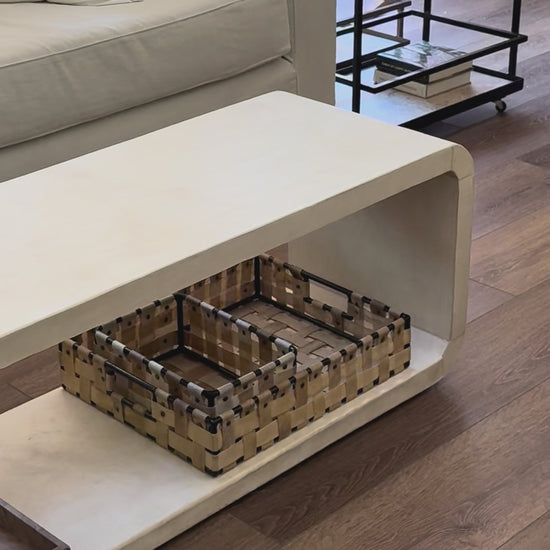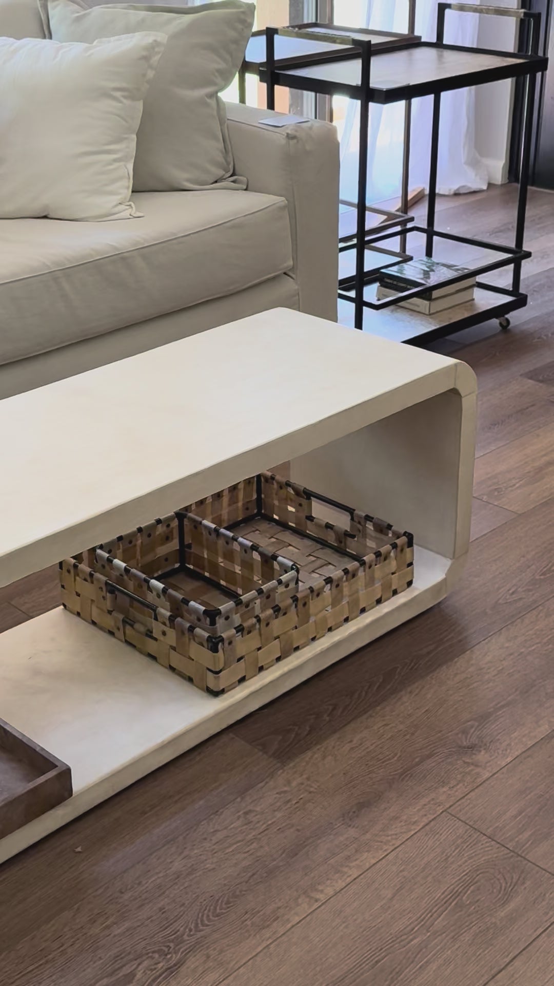 Mesa de living con líneas curvas totalmente forrada en lonja blanca. Super canchera, ideal para cortar con las líneas rectas del living sin dejar lo clásico de lado.