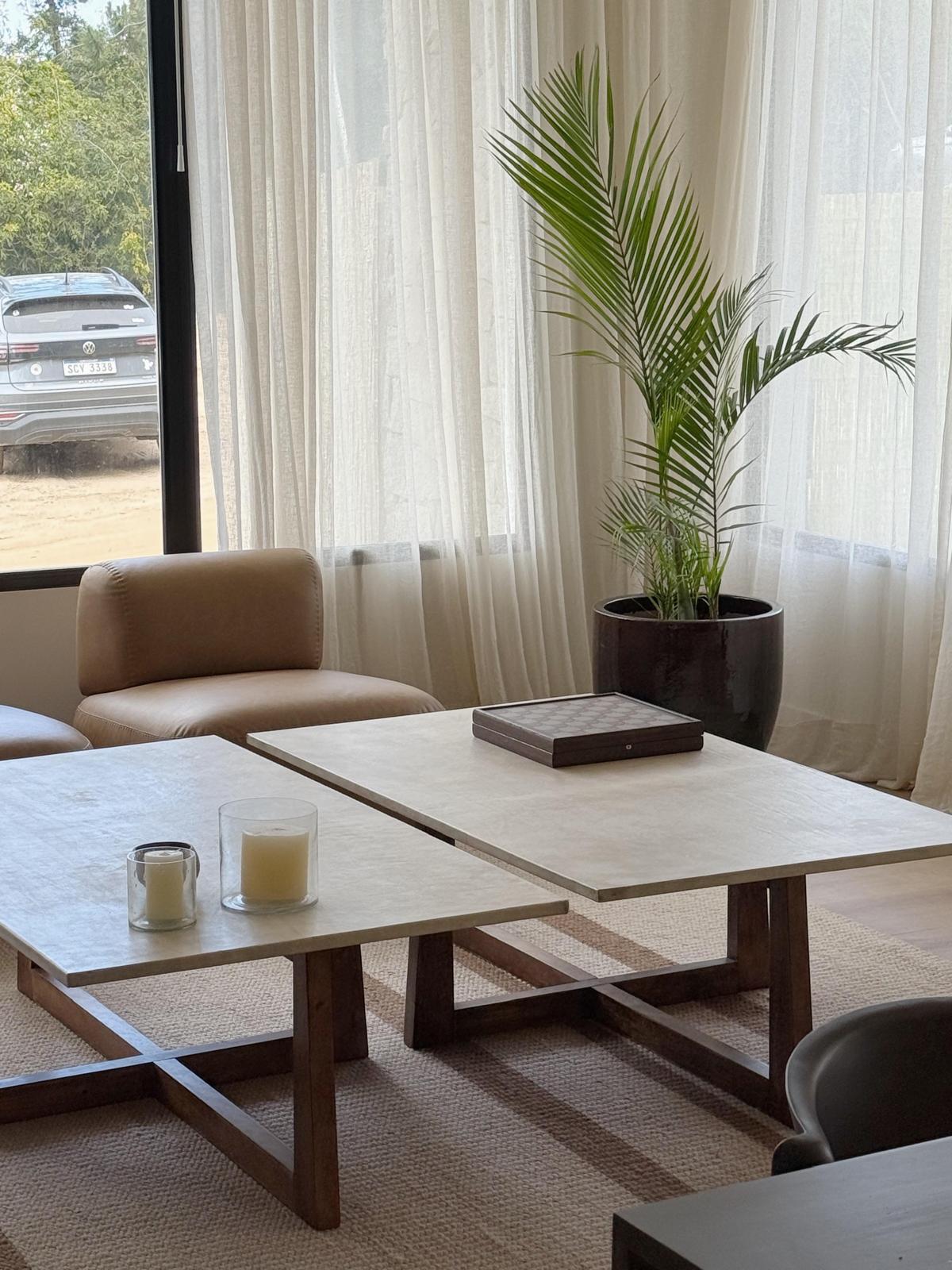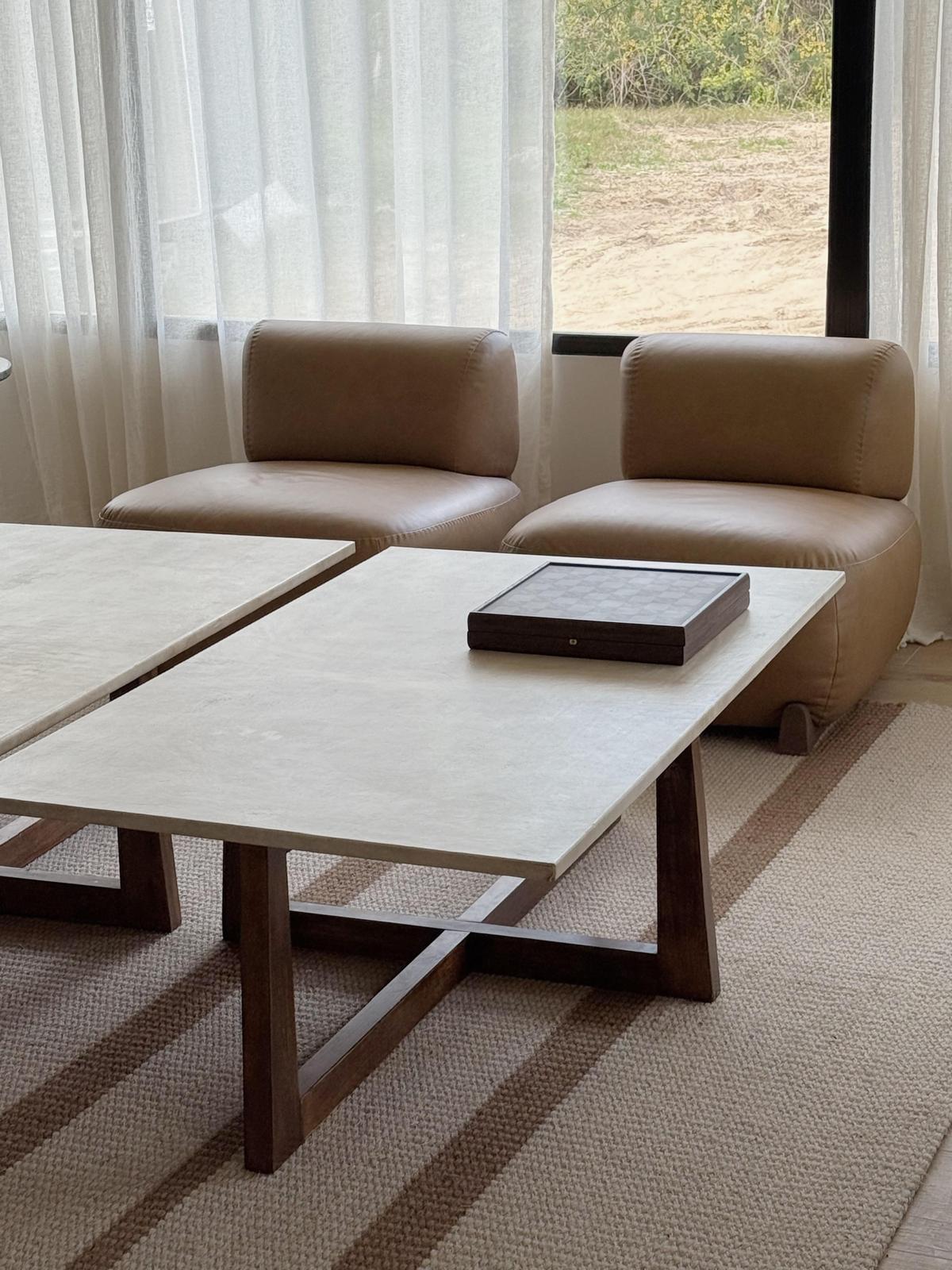 Mesa de living con base en madera en forma de cruz y tapa forrada en lonja.